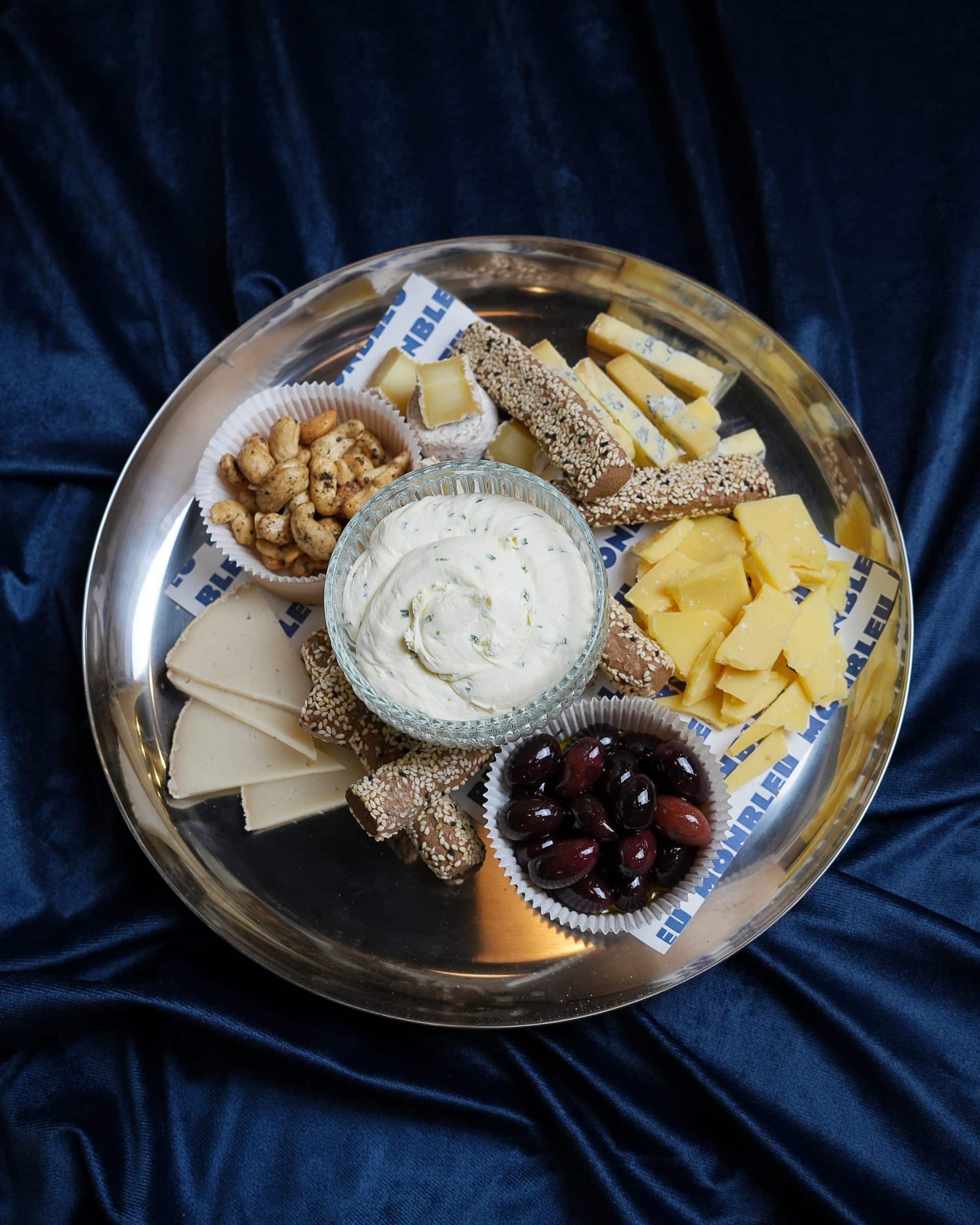Plateau de fromages Monbleu, noix de cajou à la truffe, gressins & olives Kalamata