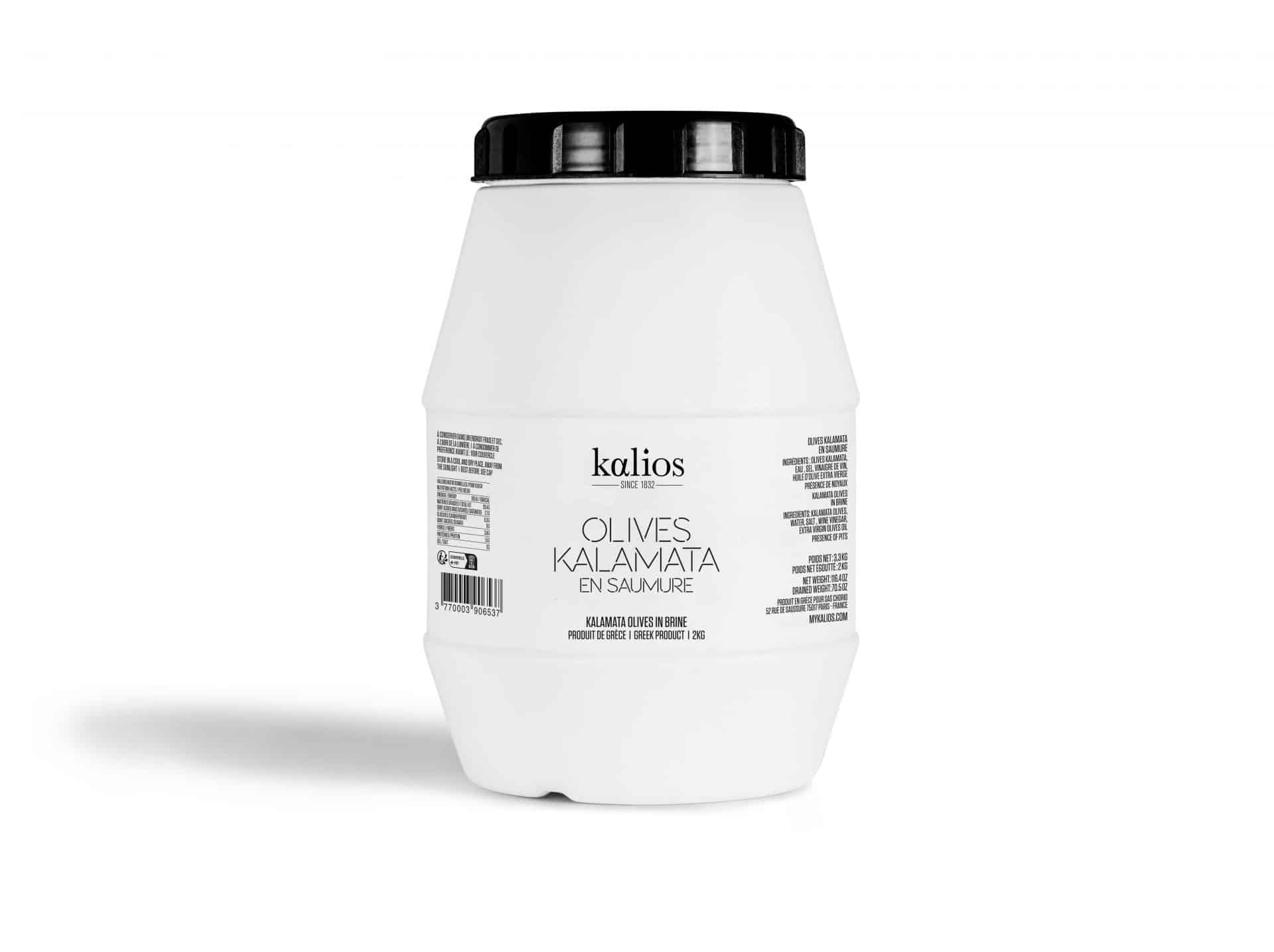 Le pot contient 2kg net égoutté d’olives Kalamata.